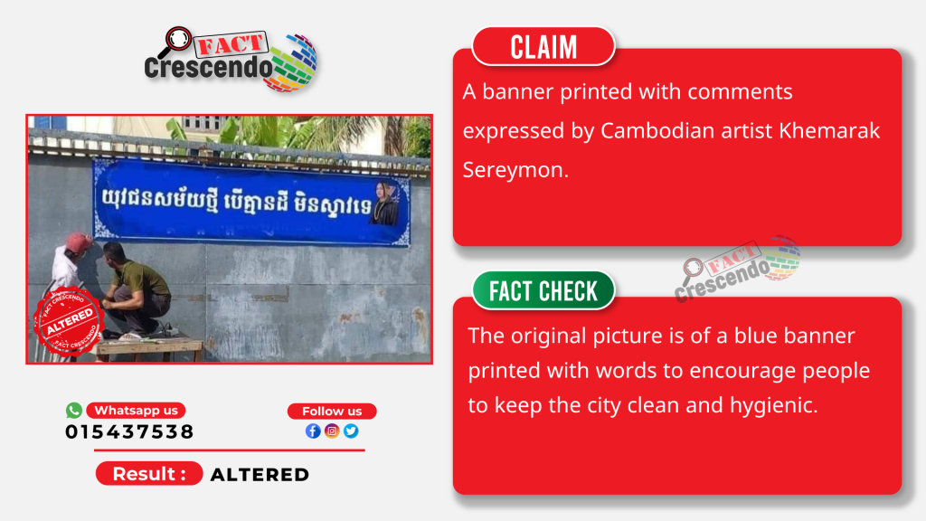 Fact Crescendo Cambodia found out the picture mentioned above was altered. The original photo shows two men hanging a blue banner raising awareness of hygiene and the environment some years ago. It is unrelated to Cambodian artist Khemarak Sereymon’s speech.