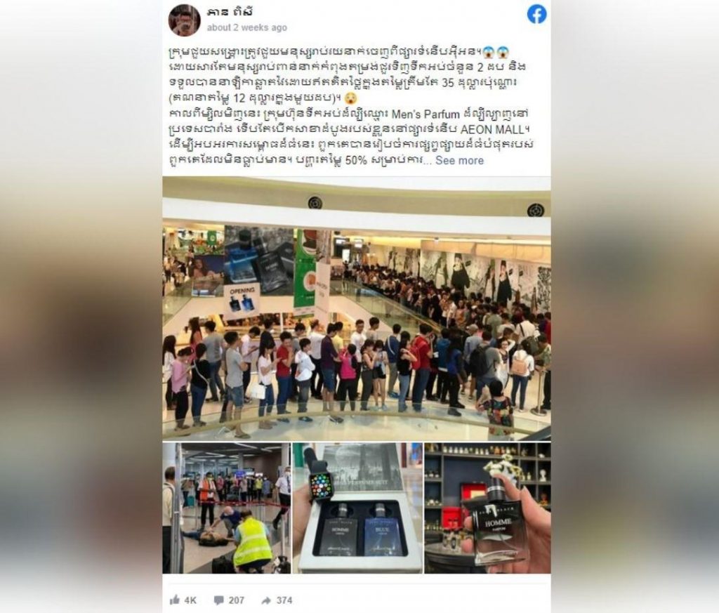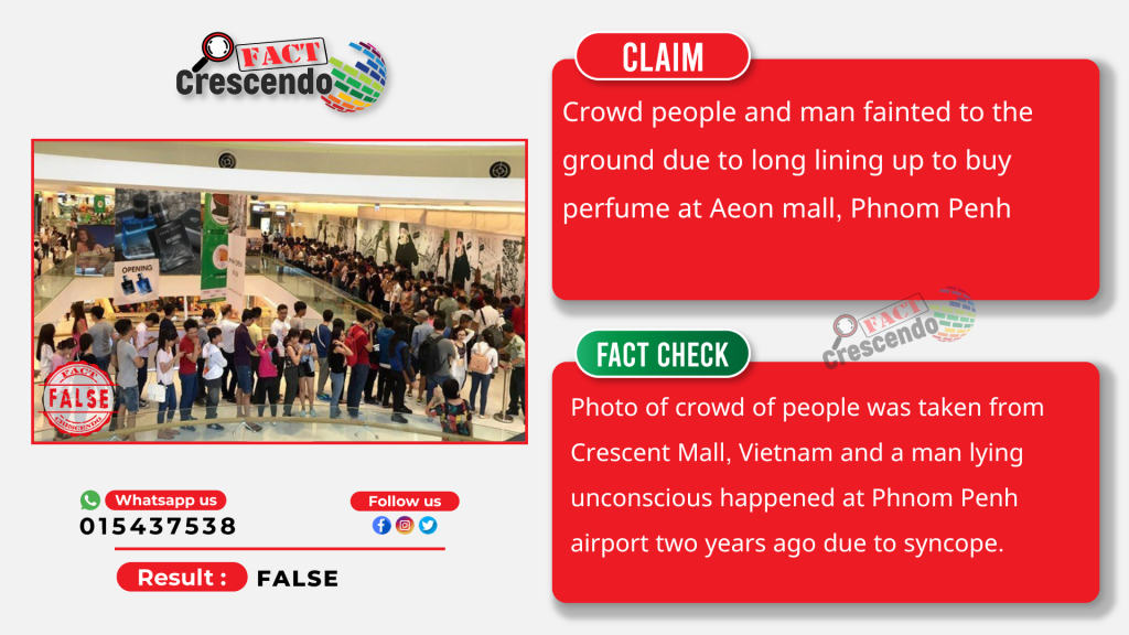 Photos showed a mob of people gathered in a mall and a man passing out on the ground were shared on a Facebook page. The claim that it occurred and that it was taken from the Aeon mall in Phnom Penh and that the man passed out because of the long lines to purchase two bottles of perfume was linked to the goods. Numerous Facebook users who speak Khmer have shared this claim and given it a varied response. The Google Reverse Image search, however, demonstrates that the images that accompanied the above claim were false.