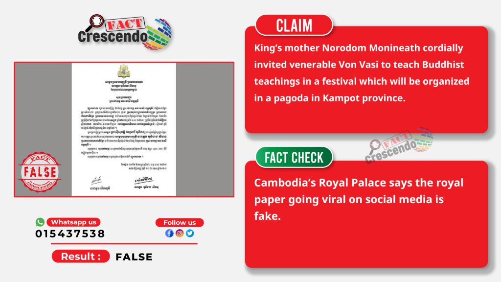 Fact Crescendo Cambodia found out the claim mentioned earlier is false. Cambodia’s Royal Palace dismissed the claim, saying the letter is fake.