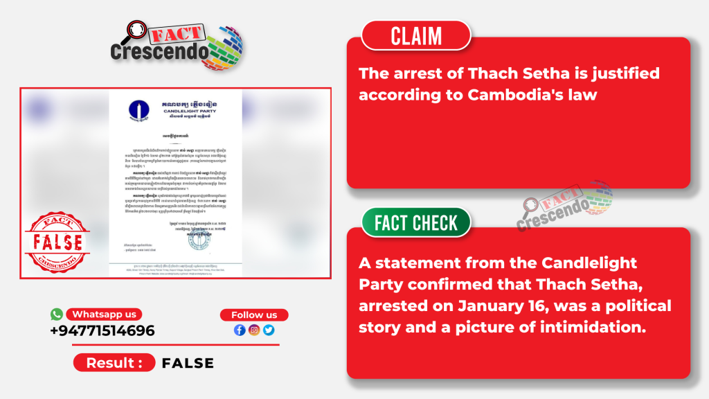 Fact Crescendo Cambodia finds that the photos and statements of the above Facebook users are false. A statement from the Candlelight Party confirmed that Thach Setha, arrested on January 16, was a political story and a picture of intimidation.