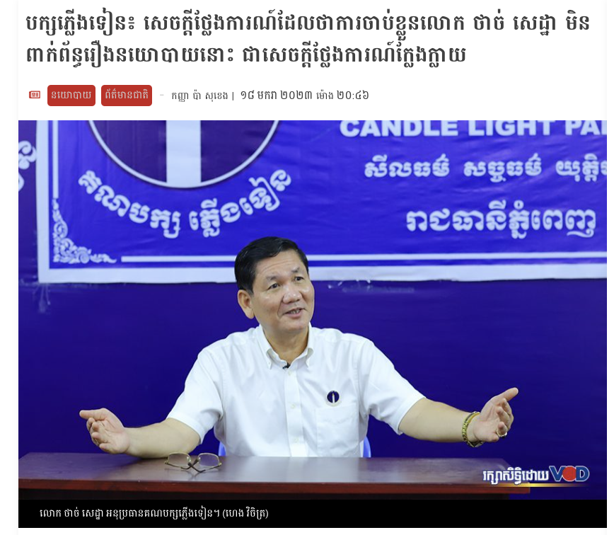 The above case was also published on the VOD local news website on January 18, 2023. It was reported that “Candlelight Party: Statement that Thach Setha’s arrest was irrelevant to the political story is a fake statement.”