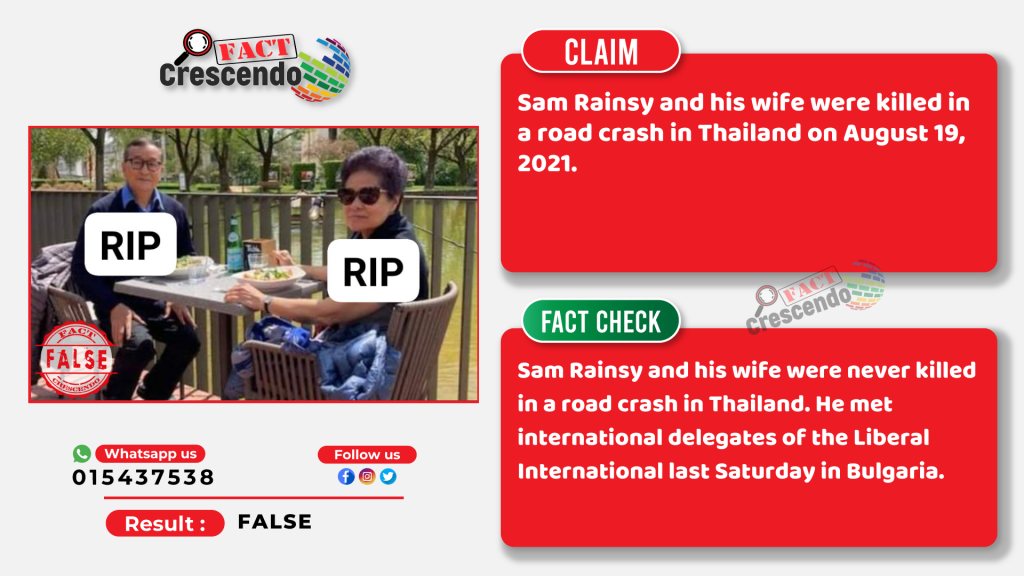 A Facebook page claimed Cambodia’s opposition leader Sam Rainsy and his wife were killed in a road crash in Thailand on August 19, 2021. The social media user also posted some pictures of the opposition leader and his wife with overlaid text ‘RIP’ – Rest in Peace – a condolence word expressed to someone’s death.