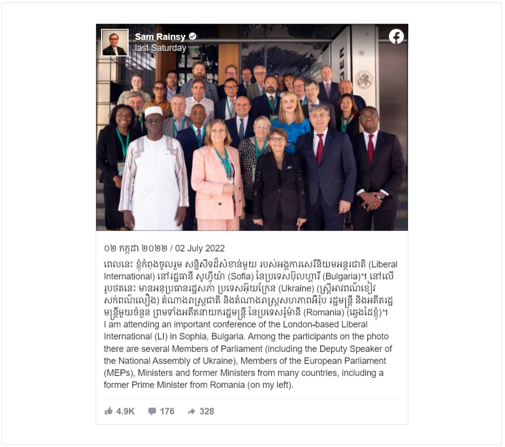 A photo posted on his Facebook page last Saturday shows Sam Rainsy was with a group of international delegates at a conference of the Liberal International (LI) held in Sofia, Bulgaria.