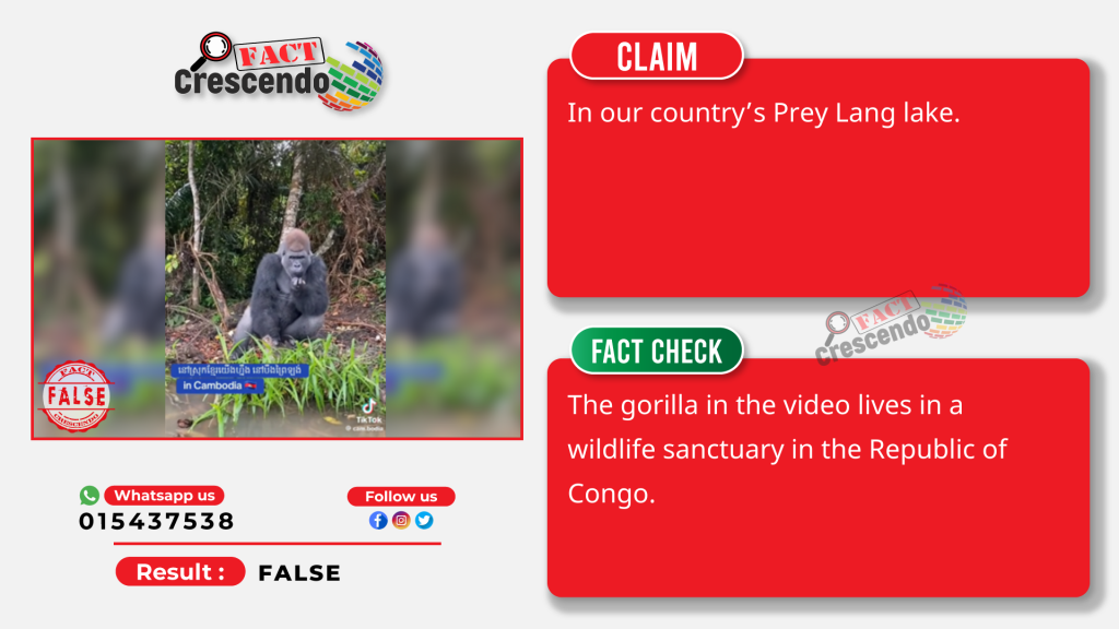 Fact Crescendo Cambodia found out the claim mentioned above is false. The gorilla in the one-minute video does not live in Cambodia’s protected forest Prey Lang. The video is of gorillas living in Lesio Louna Wildlife Reserve in the Republic of Congo.