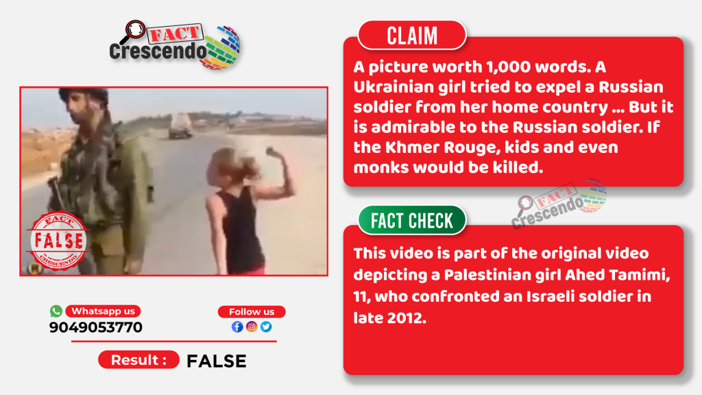 Fact Crescendo Cambodia found out the claim mentioned above is false. The video clip is unrelated to Ukraine-Russia Crisis, and a girl in the video is not Ukrainian. The video is part of the original video showing a Palestinian girl Ahed Tamimi angrily confronting an Israeli soldier in 2012.