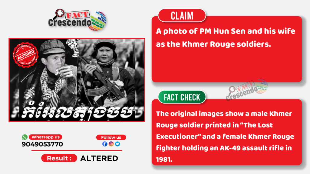 Fact Crescendo Cambodia found the photo as mentioned above was altered. The images do not show Prime Minister Hun Sen and his wife in the Khmer Rouge uniforms. The original images depict a man and a woman in the Khmer Rouge uniform with an AK-49 rifles in their hands.