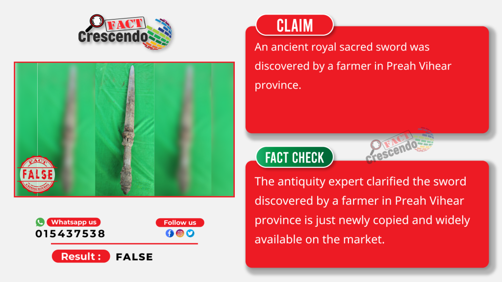 Fact Crescendo Cambodia found out the claim mentioned earlier is false. The sword is not an ancient antiquity as the claim said. Officials from the Ministry of Culture and Fine Arts clarified it is a newly made sword and widely available at markets.
