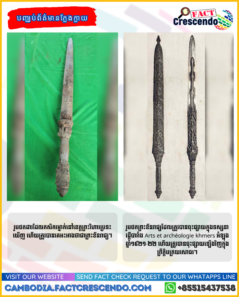 News reports early this week said several pieces of Cambodia’s ancient antiquitys and sculptures would be returned home after they were looted from this country decades ago. Then, a claim going viral on social media said Preah Khan Reach – an ancient royal sword – was discovered by a farmer in Preah Vihear province. The claim has been widely shared, commented on, and reacted by social media users. However, after getting clarification from officials from the Ministry of Culture and Fine Arts, we found the claim is false.