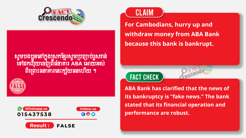 Fact Crescendo Cambodia found that the information described above is false. An ABA Bank official and stakeholders in the Cambodian banking sector have confirmed that ABA Bank’s bankruptcy is “fake news”. A representative of ABA Bank stated that the bank maintained its profit growth earlier this year and is committed to providing long-term financial services in Cambodia.