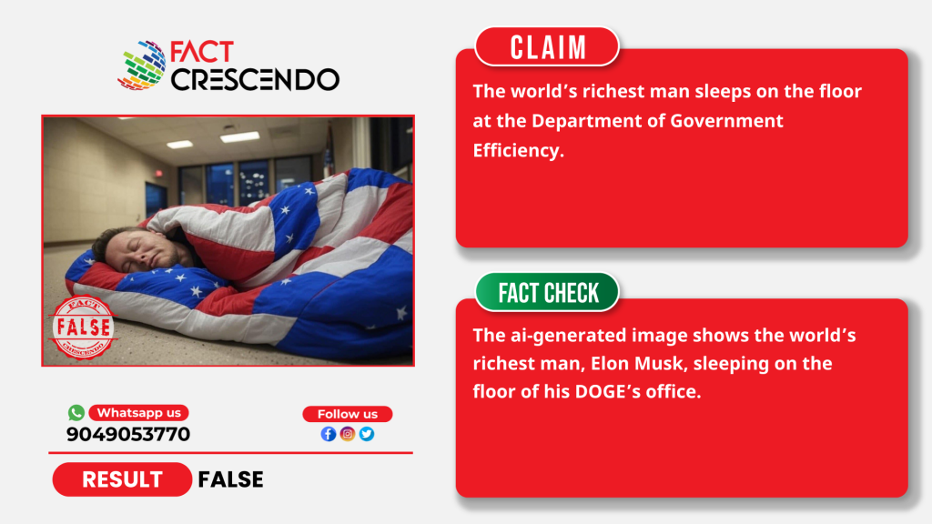 Elon Musk, the world’s wealthiest individual, was nominated by US President Donald Trump as Secretary of Government Efficiency. Just over two weeks later, a photo emerged on social media showing Musk sleeping on the floor. The image was accompanied by claims that it depicted the billionaire asleep in his office. However, after thorough verification, we found this claim is false.