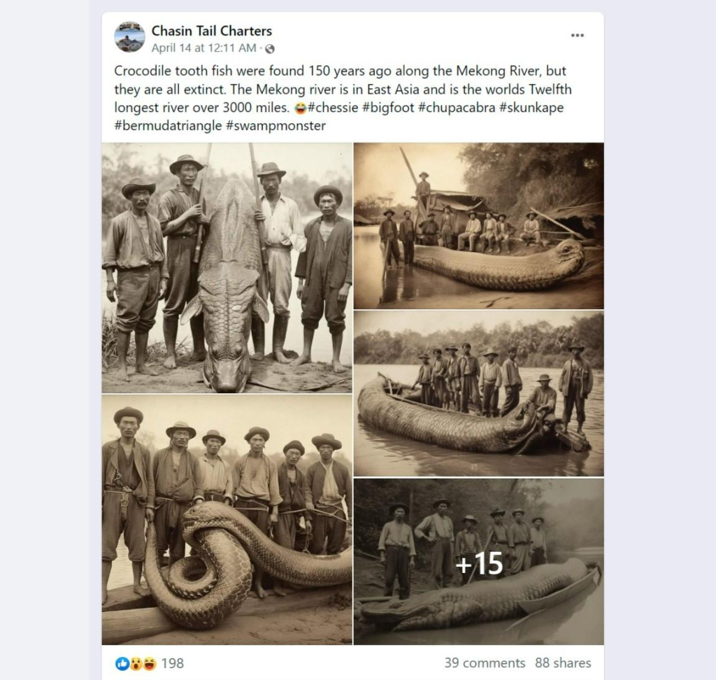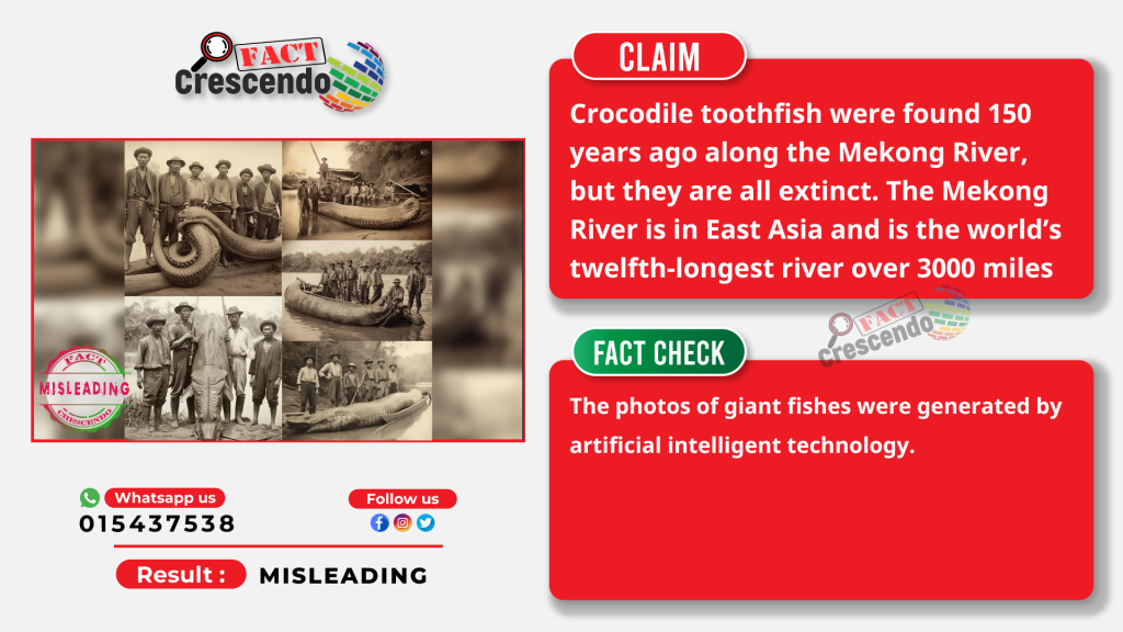 Fact Crescendo Cambodia found the post of the photos mentioned above is misleading. The photos of giant fishes were generated by artificial intelligent technology. They are not mysterious creatures living along the Mekong River 150 years ago.
