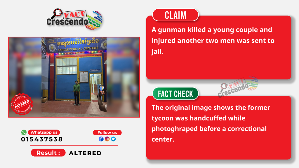 Following a court order for the detention of a gunman responsible for the tragic deaths of a young couple and two others in the Chbar Ampov district last week, a photo displaying the former tycoon standing with his hands cuffed gained wide circulation on social media. The dissemination of the photo on social platforms has resulted in criticism of the police’s handling of the gunman. However, Fact Crescendo Cambodia has determined that the image was digitally manipulated.