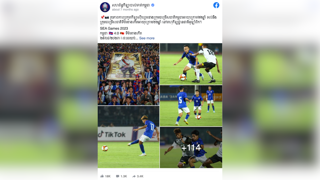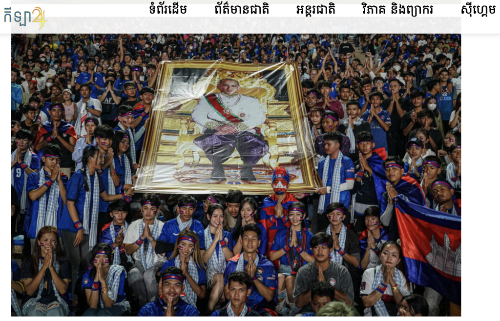 Similarly, the view of Cambodian football fans standing and holding the portrait photo of Cambodian King Norodom Sihamoni above was also found and posted on the official Facebook page of the Football Federation of Cambodia on April 30, 2023. The above Facebook post confirmed that it was the scene of the SEA Games match between the Cambodian U22 national team and the national team of East Timor U22s at the National Olympic Stadium in Phnom Penh.