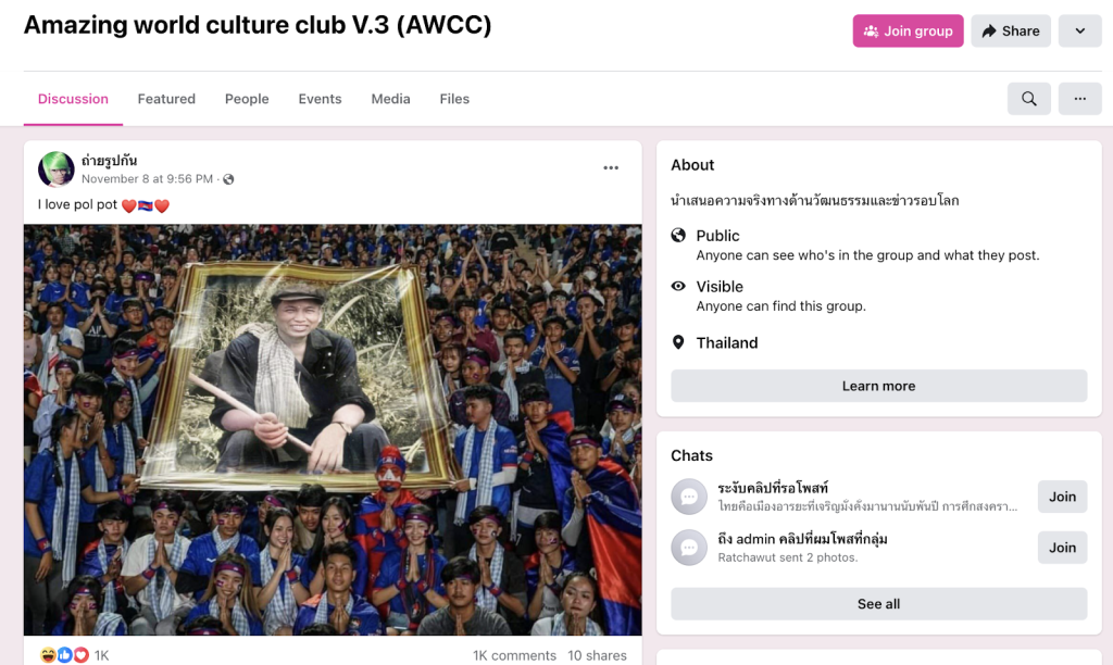 On November 8, 2023, a Facebook user posted a photo to a Facebook group called “Amazing World Culture Club V.3 (AWCC)” showing the fans of the Cambodian national football team standing and holding a photo of former Khmer Rouge leader Pol Pot. Photos attached to this post have been distributed several times, with mixed reactions and expressions from both active Thai and Khmer Facebook users.