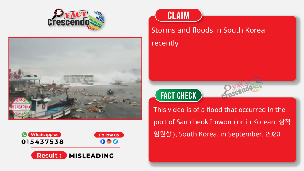 Fact Crescendo Cambodia found that the video clip attached to the claim above is misleading. This video is of a flood that occurred in the port of Samcheok Imwon (or in Korean: 삼척 임원항), South Korea, in September, 2020.