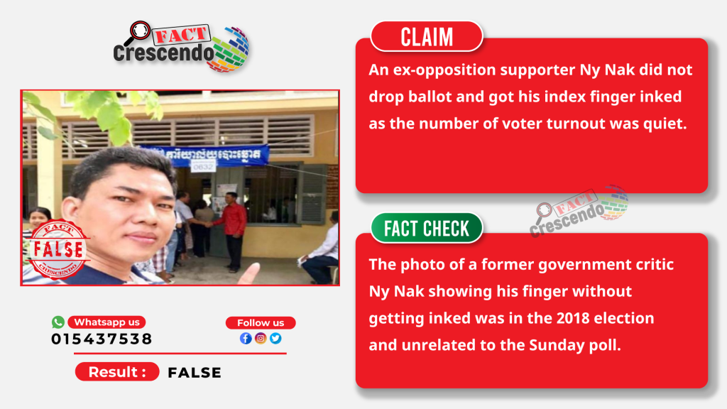 Fact Crescendo Cambodia found the claim mentioned above is false. The former government critic Ny Nak clarified that a photo of him showing finger without getting inked was in the 2018 election and nothing related to the 2023 election. He turned out for the Sunday election.