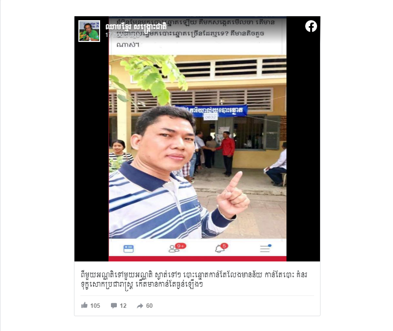 In a Facebook post, Ny Nak who uses a Facebook account named iMan-KH said he went to cast a ballot in an election office in a pagoda in Phnom Penh.