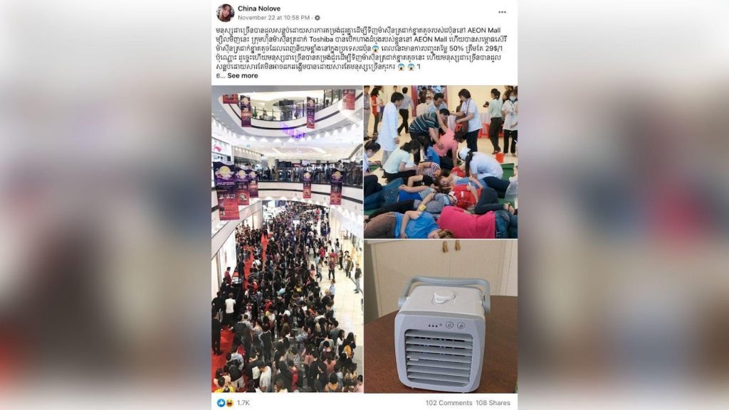 The following screenshot was captured from the Facebook page above that read in Khmer and translated into English: “Many people fainted due to queuing to buy small air conditioners of Japan at AEON Mall Phnom Penh yesterday”.