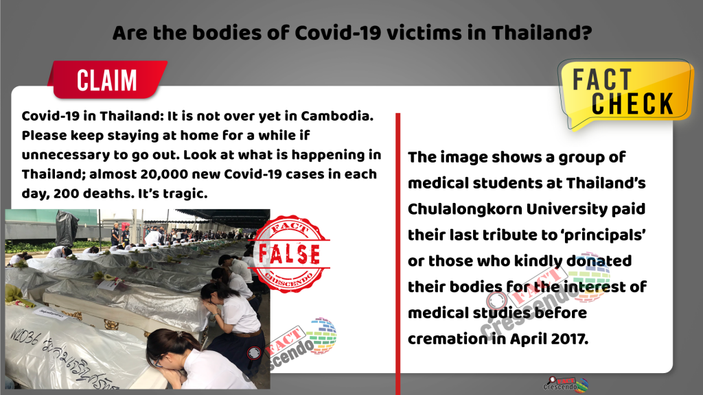 Fact Crescendo Cambodia found out the claim along with photo mentioned above is misleading. The photo is unrelated to Covid-19 bodies. The photo shows a group of medical students at Thailand’s Chulalongkorn University paid their last tribute to ‘principals’ or those who kindly donated their bodies for the interest of medical studies before cremation in April 2017.