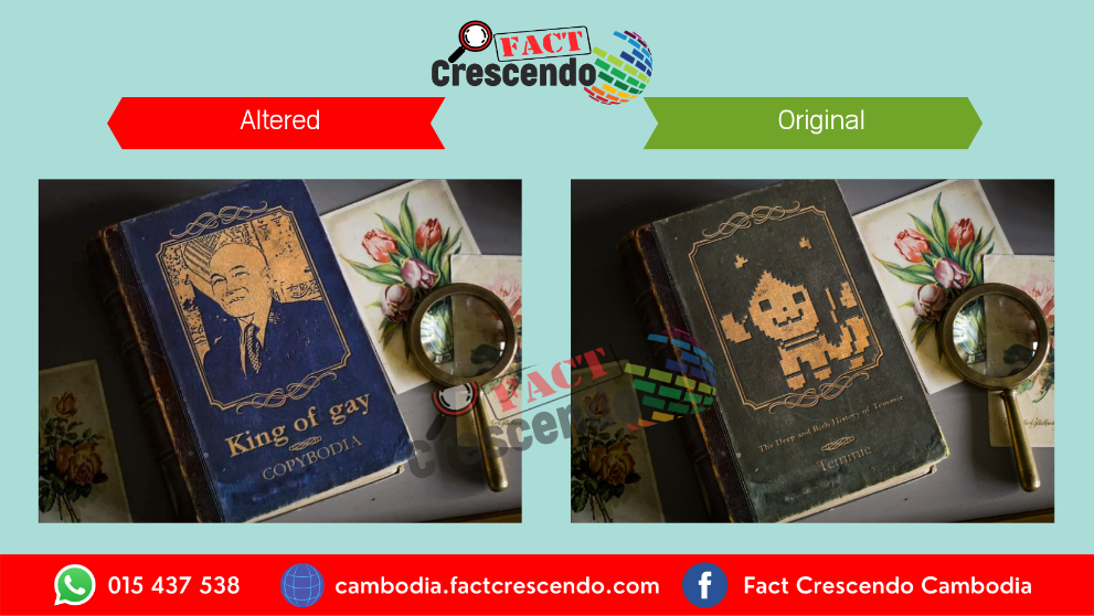 Fact Crescendo Cambodia found the three photos mentioned earlier are digitally edited. The original photos show no images of Cambodian King Norodom Sihamoni were printed in the book. “The Deep and Rich History of Temmie” book`s cover is shown by photo.
