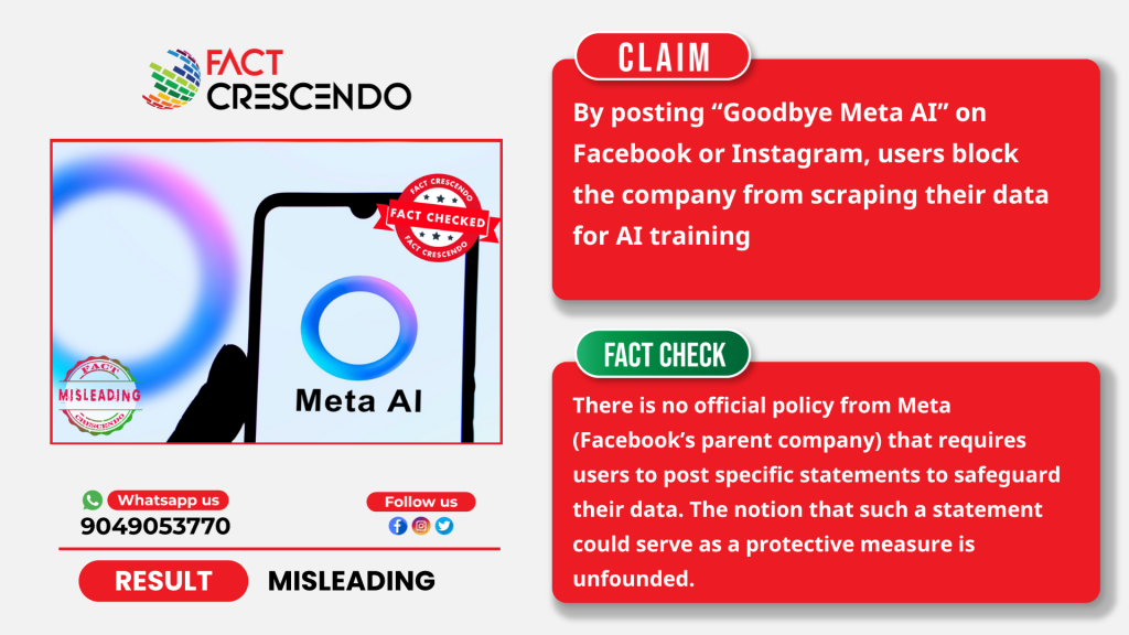 Fact Crescendo found the claim in the viral post to be misleading. There is no official policy from Meta (Facebook’s parent company) that requires users to post specific statements to safeguard their data. The notion that such a statement could serve as a protective measure is unfounded.