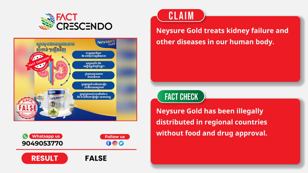 Fact Crescendo found out the promotional videos of Neysure Gold were false. The powdered milk, marketed by a Vietnamese firm, has been illegally distributed via online platforms in regional countries like Cambodia, Thailand, and the Philippines.