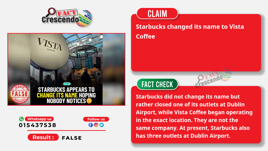 Fact Crescendo found that the above social media claim is false. Starbucks did not change its name to Vista Coffee but closed one of its outlets in Terminal 1 at the Dublin Airport when its lease agreement expired. Following the closure, a brand called Vista Coffee began operating in the exact location as a temporary measure. This is not uncommon in the retail and hospitality industries, where temporary brands or concepts may occupy spaces previously used by well-known brands like Starbucks. At present, Starbucks also has three outlets at Dublin Airport.