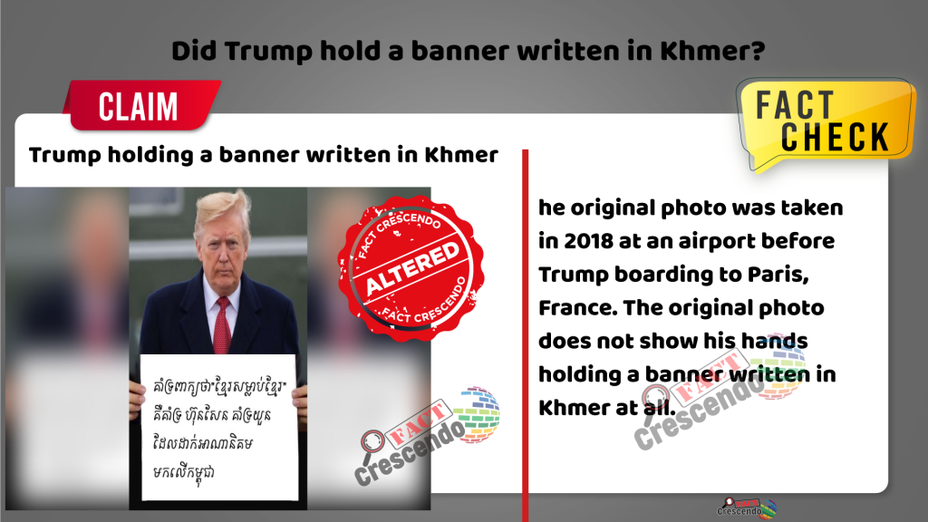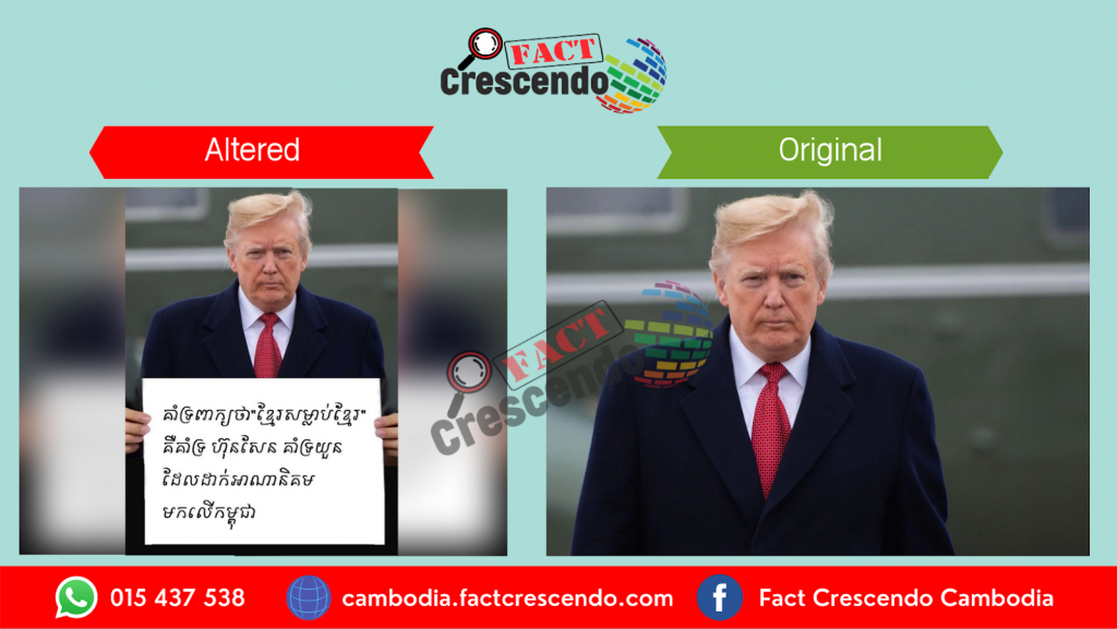 A photo of Donald Trump with the same shape and format was found on an international news website called USA Today that was published on November 10, 2018. This report confirmed that the former US president is set to pay a state visit to Paris, France. Fact Crescendo Cambodia found that the photo which was used by Cambodian to show Trump holding a banner ,written in Khmer language was altered. It was taken at Andrews Joint Base in Maryland without showing his hand holding a banner at all.