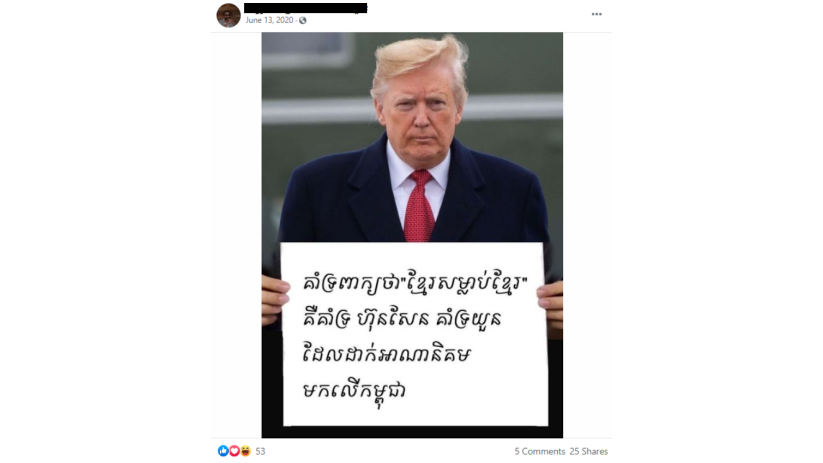 On June 13, 2020, one of the Facebook users posted a photo with Donald Trump, known as the former president of the United States. This photo shows him holding a banner written in Khmer that means to tell people that if you all support the word “Khmer kills Khmer” is likely to support Prime Minister Hun Sen and Vietnam came to colonize Cambodia. Photo attached with this post has been shared several times, along with mixed reactions and expressions from Facebook users who are speaking Khmer.