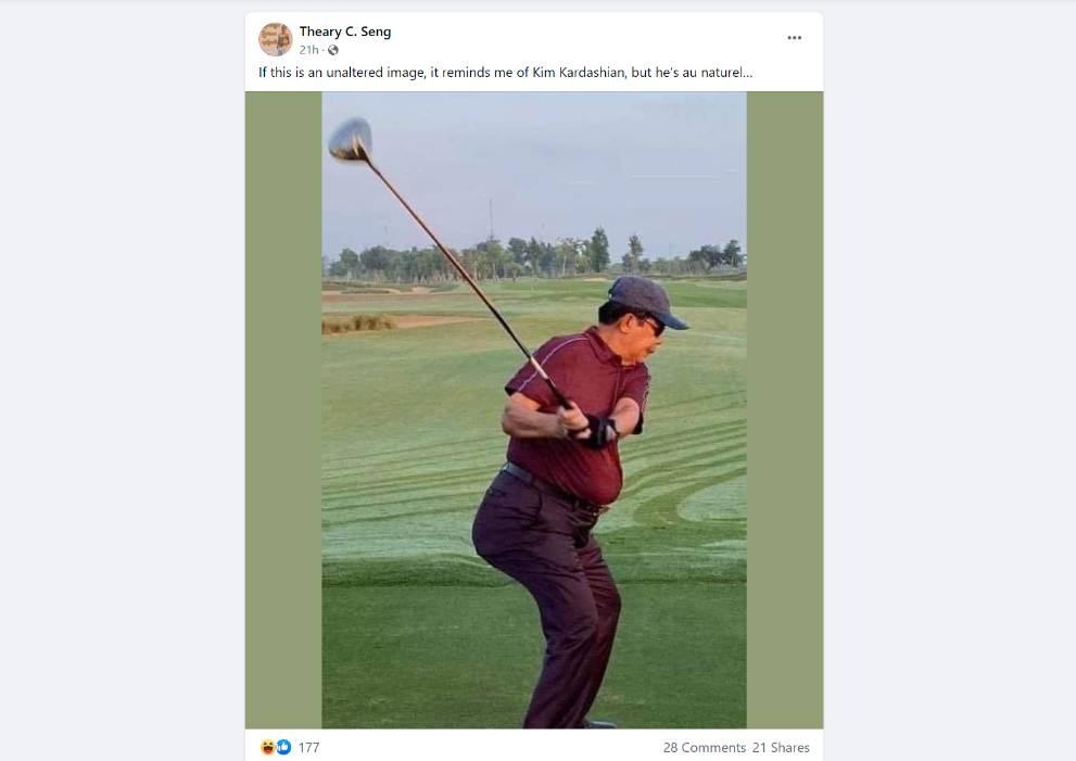 Fact Crescendo Cambodia found out the photo posted by the social media user mentioned above is altered. The original image shows Prime Minister Hun Sen playing golf in 2019 without having big buttock and belly like Kim Kardashian.