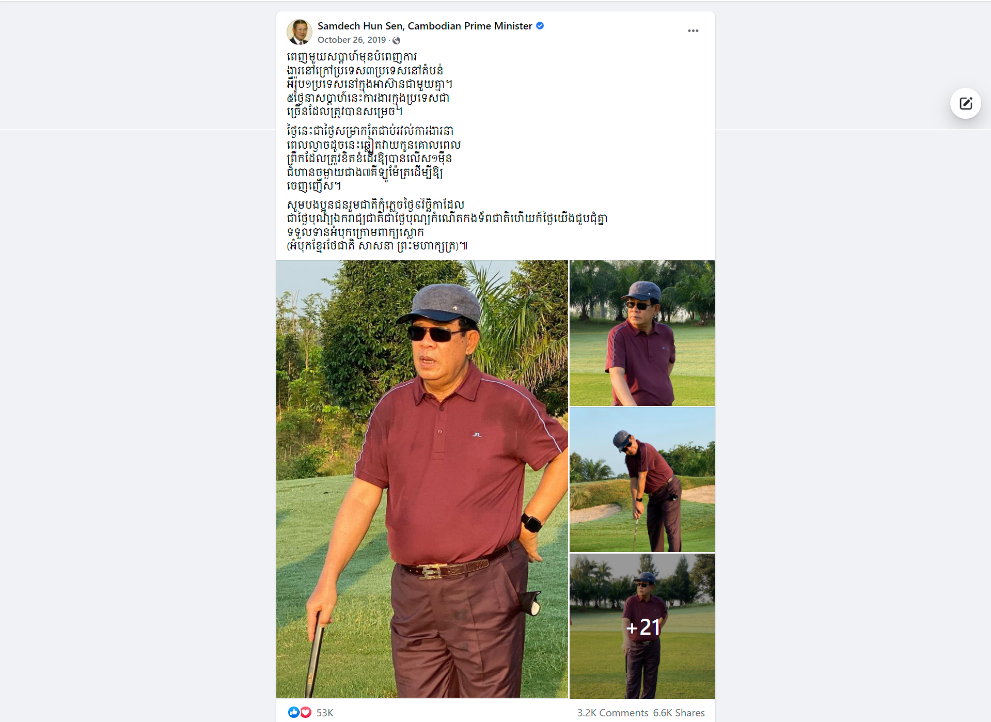 This image was found in Samdech Hun Sen, Cambodian Prime Minister, the official Facebook page of PM Hun Sen. The social media page posted the photo on October 26 in 2019, showing PM Hun Sen playing golf at a field.