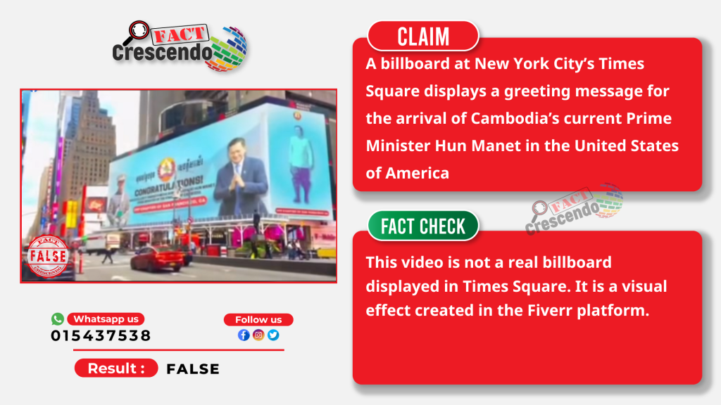 Fact Crescendo Cambodia find out the claim mentioned above is false. The video circulated by ex-Prime Minister Hun Sen’s Facebook page is false is not a real life at Times Square. It is a visual advertisement which was created in the Fiverr’s platform.