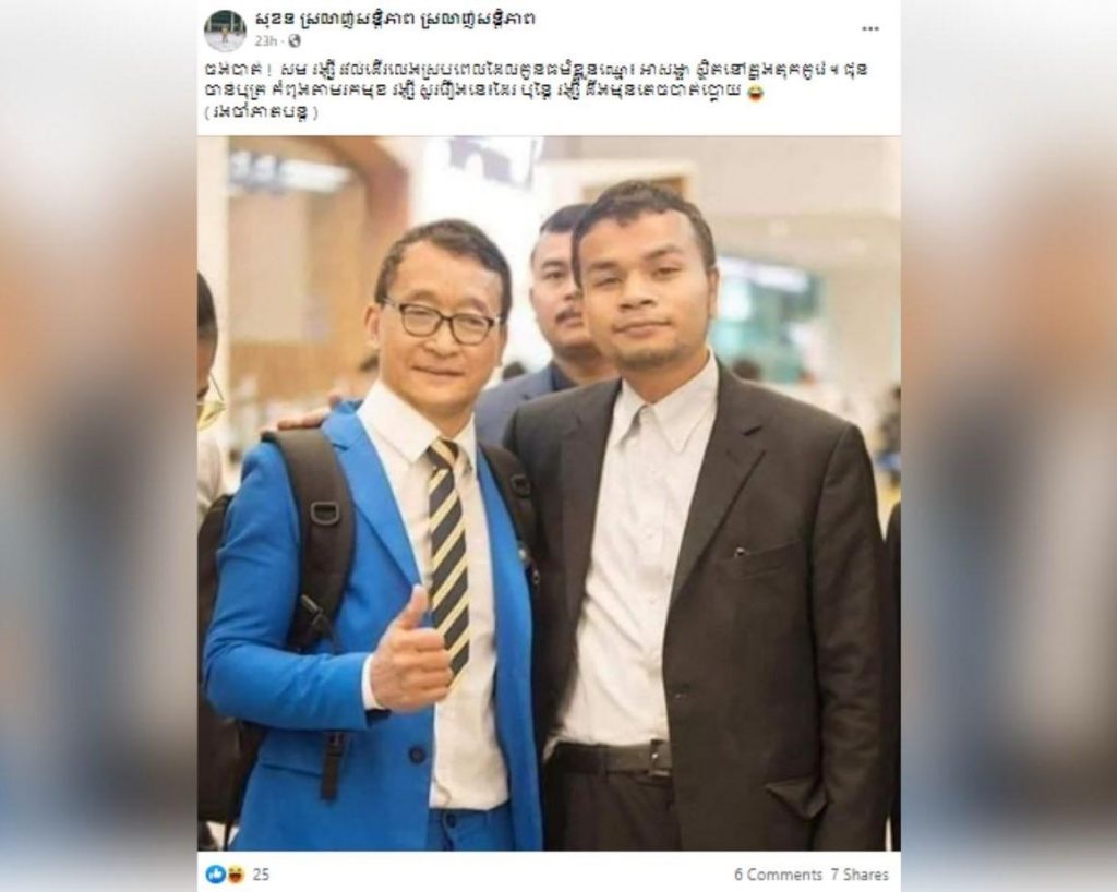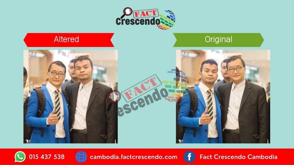 An exact photo with the same shape and form was found on Ah Song Ha’s personal Facebook account, which was posted on August 24, 2019. The same user did not show the scene of Sam Rainsy standing with his thumb up, but instead the photo was factually of Ah Song Ha in a blue shirt standing with his thumb next to the former leader of the Cambodian National Rescue Party (CNRP), Sam Rainsy.