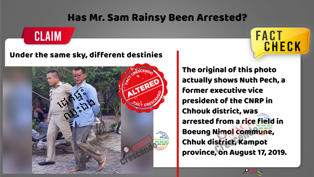 Fact Crescendo Cambodia has found that the photo posted and claimed by the above user was altered. This photo had been edited before it was posted on social media. The original of this photo actually shows Nuth Pech, a former executive vice president of the CNRP in Chhouk district, was arrested from a rice field in Boeung Nimol commune, Chhuk district, Kampot province, on August 17, 2019.