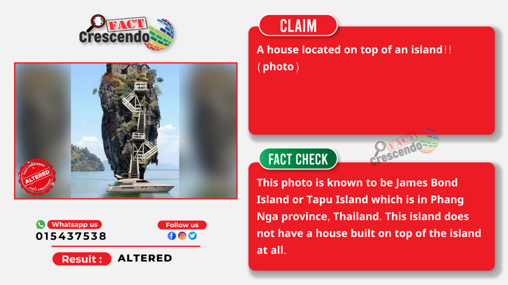 Fact Crescendo Cambodia found that the photo shared by the above Facebook page was false. It was altered before posting on social media platforms. This photo is known to be James Bond Island or Tapu Island which is in Phang Nga province, Thailand. This island does not have a house built on top of the island at all.
