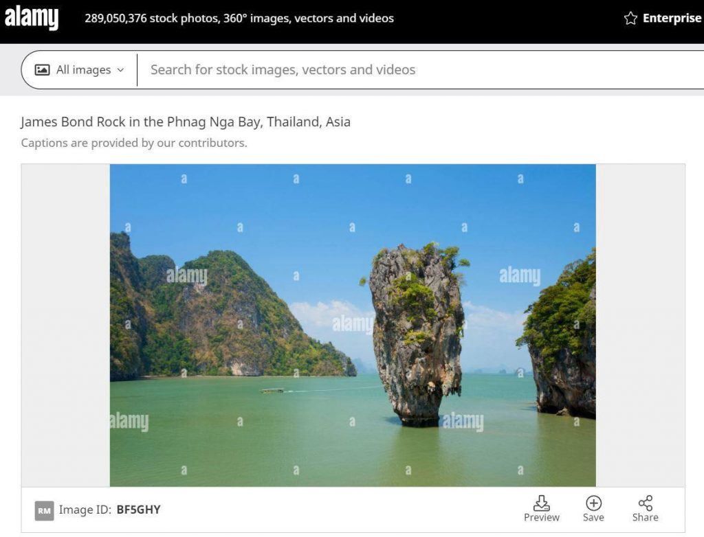 Likewise, a photo showing the same angle of this island can also be found on the Alamy website. This website has provided detailed information about the above photo in English as “James Bond Rock in the Phang Nga Bay, Thailand, Asia”.