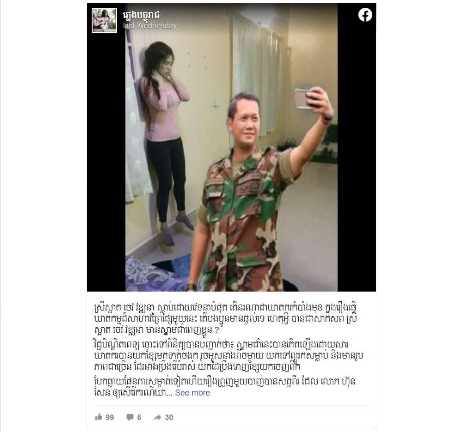 A Facebook page posted a picture about two weeks ago, showing Prime Minister Hun Sen’s oldest son Hun Manet who is Cambodia’s current army commander taking a selfie with a body of a woman who allegedly committed suicide more than 4 years ago.