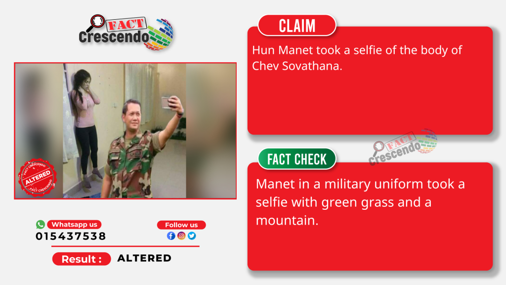Fact Crescendo Cambodia found out the picture mentioned earlier is altered. The original photo shows Prime Minister Hun Sen’s oldest son Hun Manet taking a selfie alone. And the picture of the woman’s body is of Ms. Chev Sovathana who was killed in early 2018 in Takeo province.