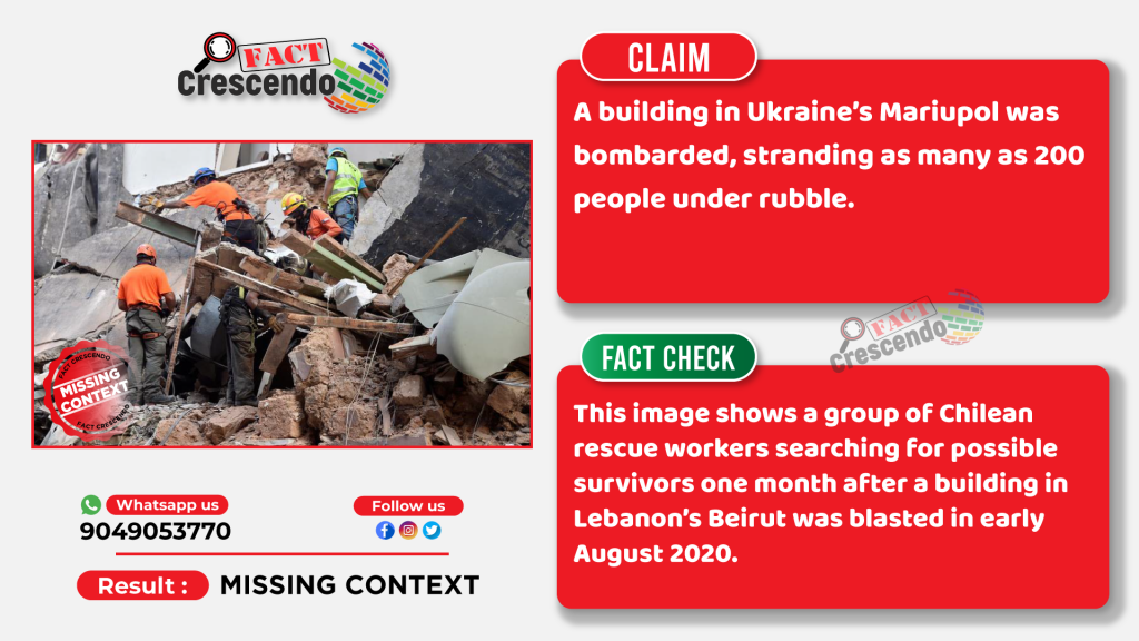 Fact Crescendo Cambodia found out the claim mentioned above is missing context. The image is unrelated to the ongoing Russian invasion of Ukraine. The image is originally about a group of rescuers searching for possible survivors under rubble a month after a building in Lebanon’s Beirut was blasted in early August, 2020.