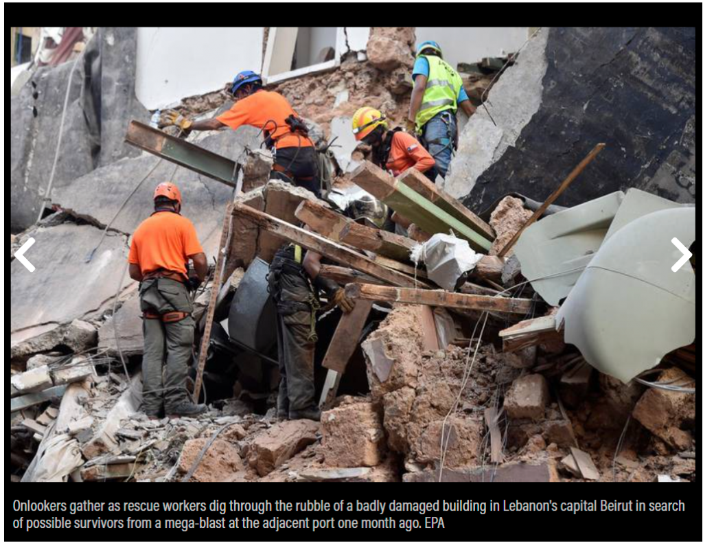 The same image was published in an article of The National on September 05, 2020. The media reported about a group of rescuers searching for possible survivors in the rubble of a building in Lebanon’s Beirut city a month after an explosive blast.