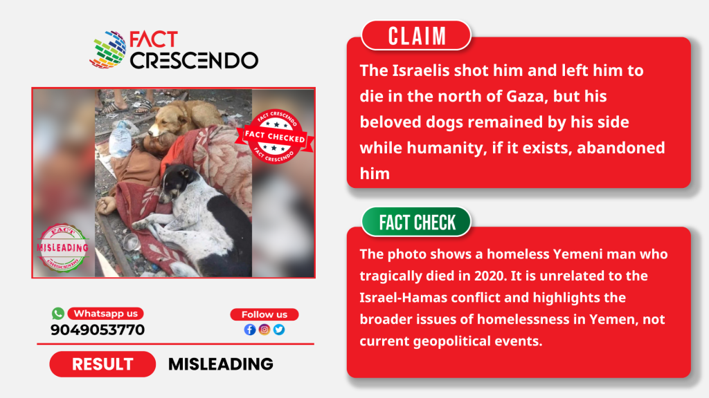 Fact Crescendo found the claim in the viral post to be misleading. The photo shows a homeless Yemeni man who tragically died in 2020. It is unrelated to the Israel-Hamas conflict and highlights the broader issues of homelessness in Yemen, not current geopolitical events.