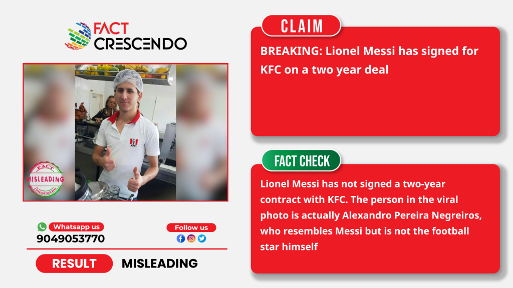 Fact Crescendo found that the above claim posted on social media is misleading. In fact, Lionel Messi has not signed a two-year contract with KFC. The person in the viral photo is actually Alexandro Pereira Negreiros, who resembles Messi but is not the football star himself.