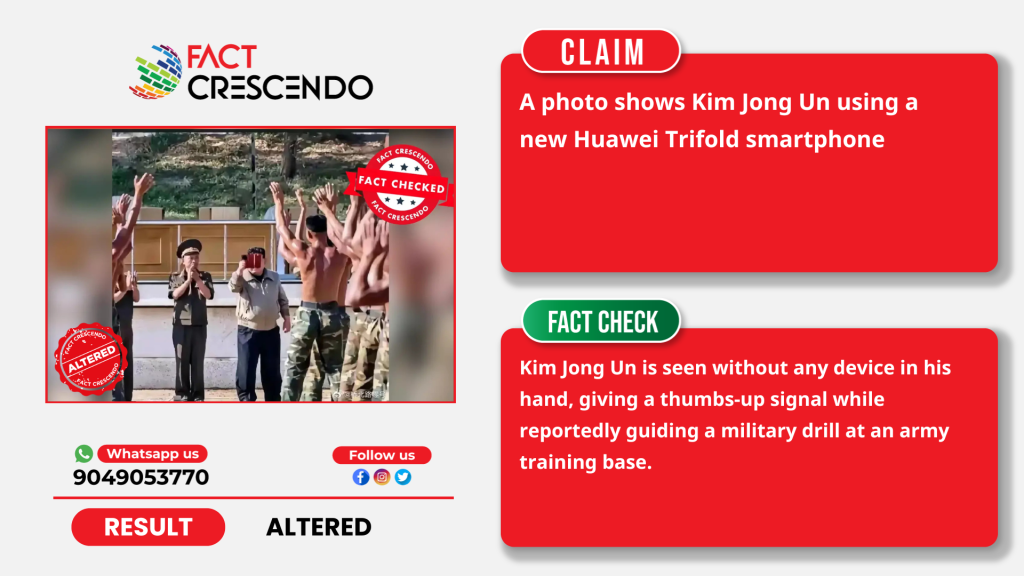 Fact Crescendo found that the above photo posted on social media has been digitally altered. Kim Jong Un is seen without any device in his hand, giving a thumbs-up signal while reportedly guiding a military drill at an army training base.