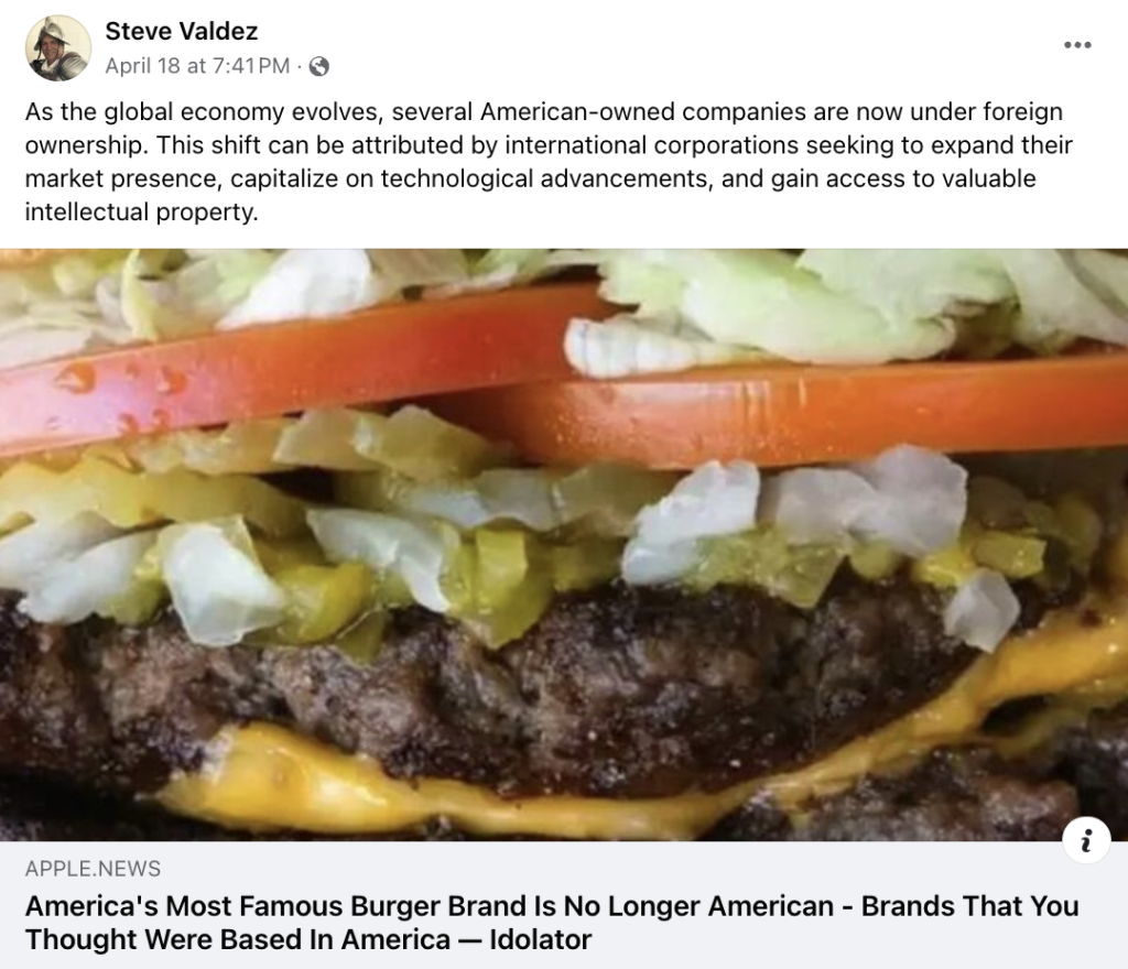 Recently, there was a viral article claiming that America’s most famous burger brand is no longer American. The above article attached to the claim referring to China has been shared by the social media users, leading them to be confused about whether this piece of news was real.