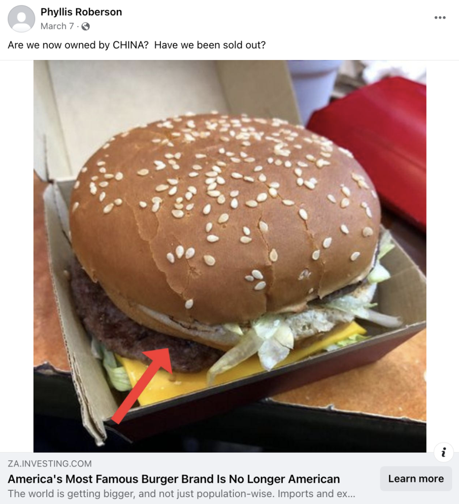 The following is a snapshot captured from another Facebook post featuring a picture of “Burger” along with a text claiming, “Are we now owned by CHINA? Have we been sold out?”.