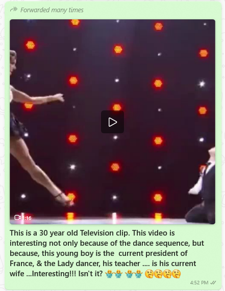 One of the Facebook users posted a video of an energetic cha-cha dance performed by a boy and a young woman. This dancing video was attached to a claim that the boy went on to become the current French President, Emmanuel Macron, while the young woman is his wife.