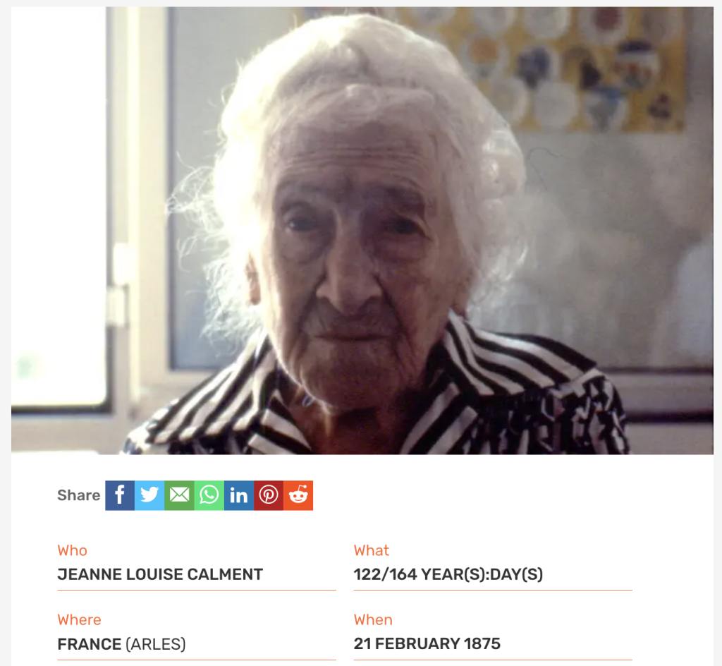 The longest-living woman on Earth, according to the Guinness Book of World Records, is Jeanne Louise, who was born on February 21, 1875, and passed away at the age of 122 years and 164 days in Arles, France, on August 4, 1997.