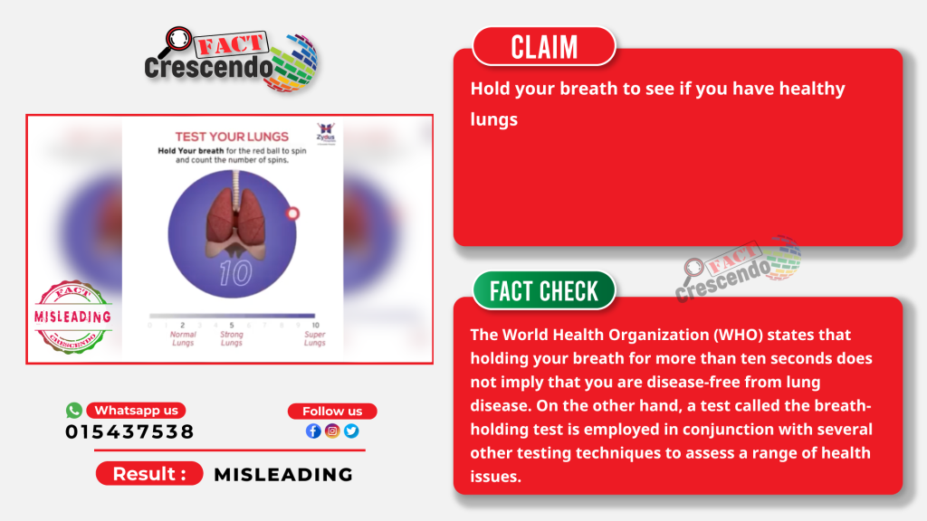 Fact Crescendo Cambodia found the claim, as mentioned above, misleading. The World Health Organization (WHO) states that holding your breath for more than ten seconds does not imply that you are disease-free from lung disease. On the other hand, a test called the breath-holding test is employed in conjunction with several other testing techniques to assess a range of health issues.
