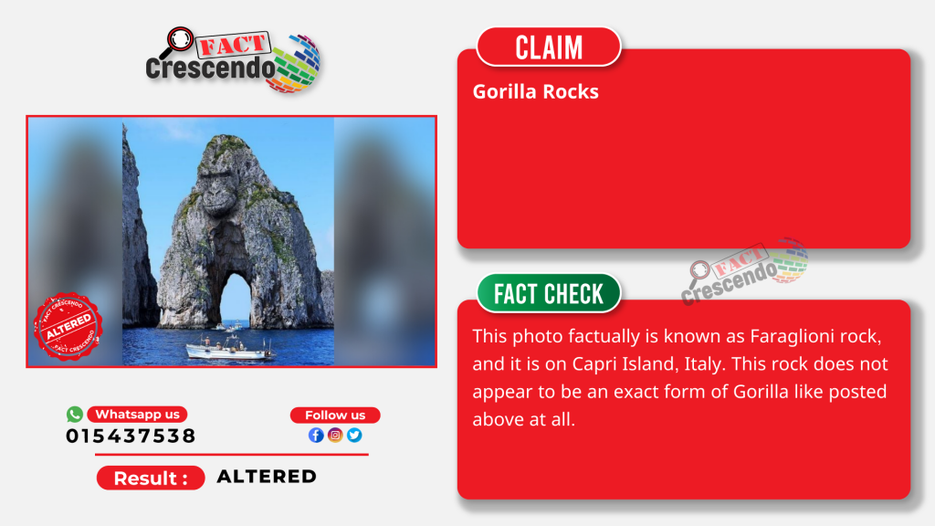 Fact Crescendo Cambodia found that the photo shared by the above Facebook page was false. It was altered before posting on social media platforms. This photo is known as Faraglioni rock, and it is on Capri Island, Italy. This rock does not appear to be an exact form of Gorilla like posted above at all.