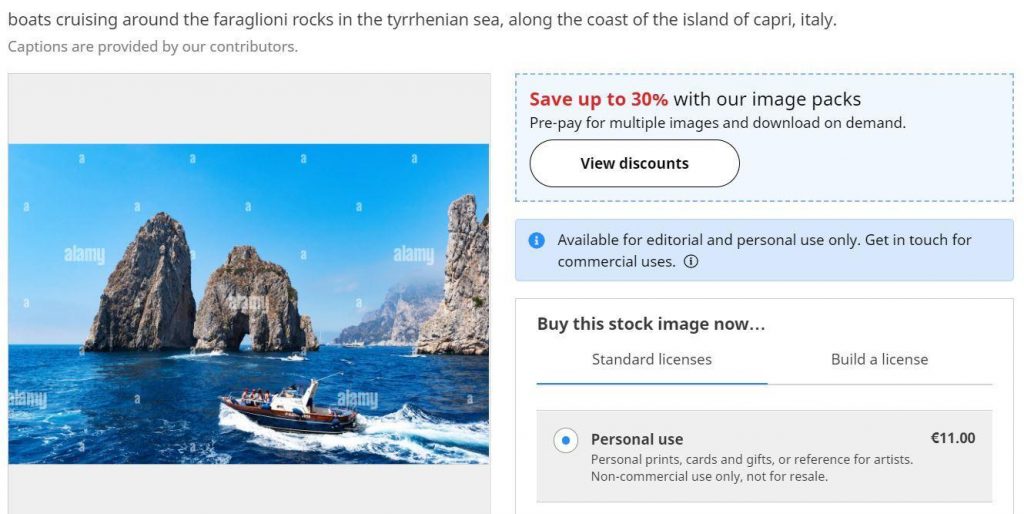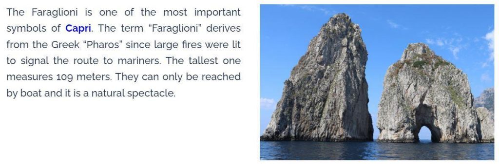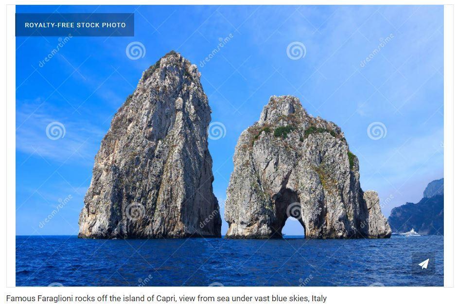 A similar photo was also found on the Italy Cat website which confirmed the location of this area in English as “The Faraglioni is one of the most important symbols of Capri. The tallest one measures 109 meters. They can only be reached by boat, and it is a natural spectacle”.